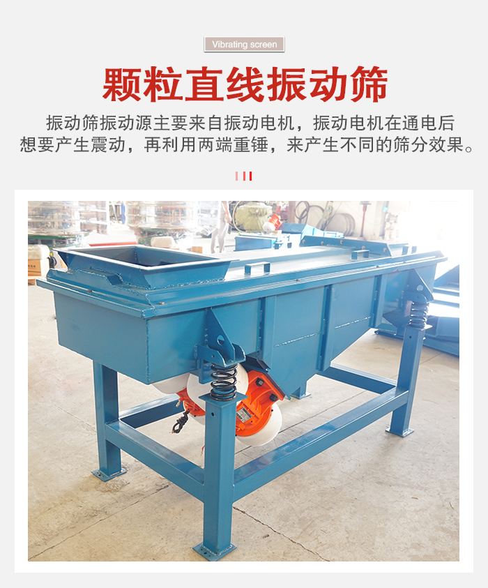 顆粒振動篩根據篩分原理主要分圓形和方形兩種結構,振動篩振動源主要來自振動電機,振動電機在通電后想要產生震動,再利用兩端重錘,來產生不同的篩分效果。